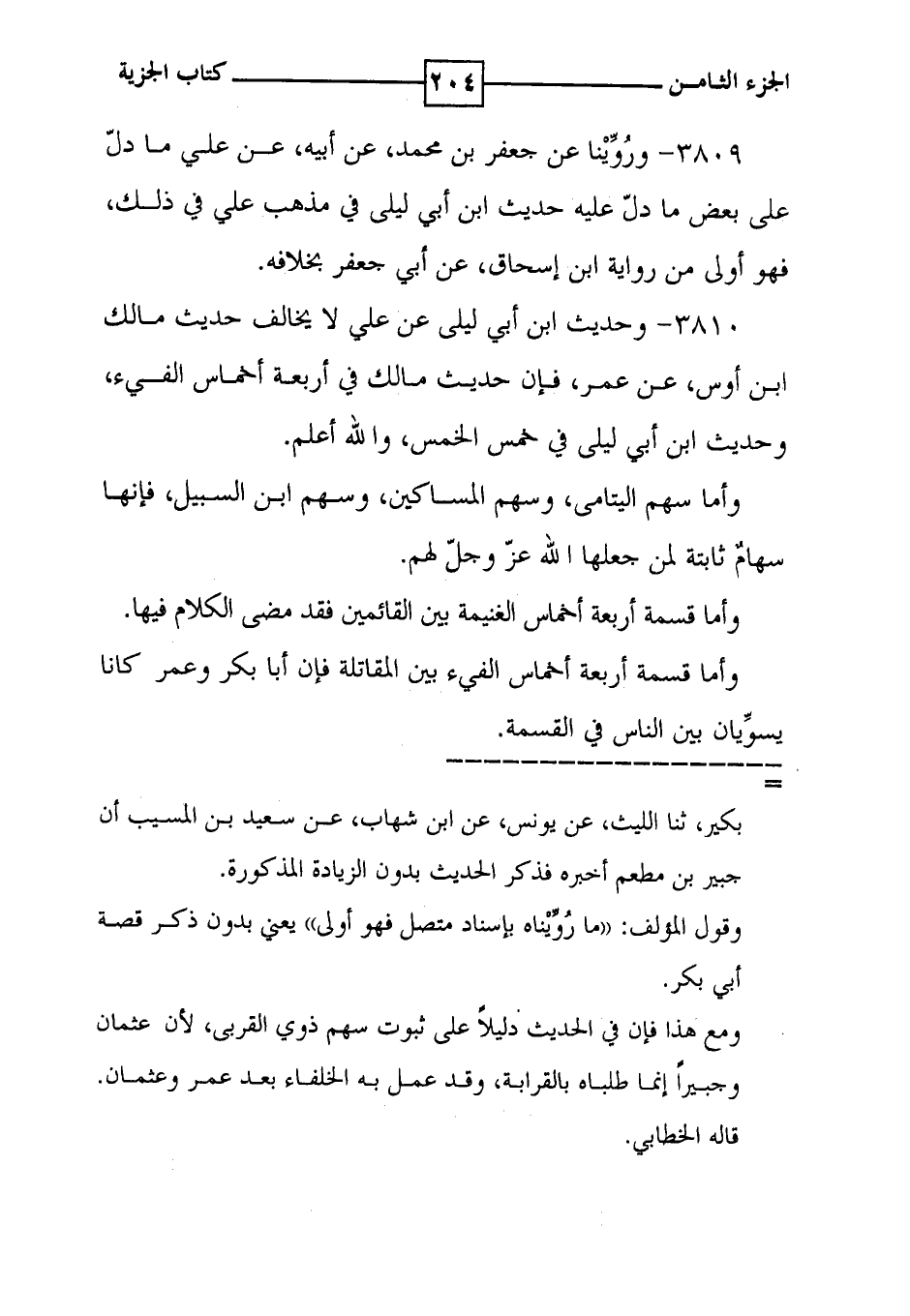 3810 - وحديث ابن أبي ليلى عن علي لا يخالف حديث مالك ابن أوس ، عن عمر ، فإن حديث مالك في أربعة أخماس الفيء ، وحديث ابن أبي ليلى في خمس الخمس ، والله أعلم . وأما سهم اليتامى ، وسهم المساكين ، وسهم ابن السبيل ، فإنها سهام ثابتة لمن جعلها الله عز وجل لهم . وأما قسمة أربعة أخماس الغنيمة بين القائمين فقد مضى الكلام فيها . وأما قسمة أربعة أخماس الفيء بين المقاتلة فإن أبا بكر وعمر كانا يسويان بين الناس في القسمة .