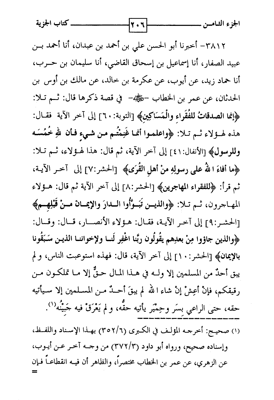3812 - أخبرنا أبو الحسن علي بن أحمد بن عبدان ، أنا أحمد بن عبيد الصفار ، أنا إسماعيل بن إسحاق القاضي ، أنا سليمان بن حرب ، أنا حماد زيد ، عن أيوب ، عن عكرمة بن خالد ، عن مالك بن أوس بن الحدثان عن عمر بن الخطاب - رضي الله عنه - في قصة ذكرها قال : ثم تلا : ! ( إنما الصدقات للفقراء والمساكين ) ! [ التوبة : 60 ] إلى آخر الآية فقال : هذه لهؤلاء ثم تلا : ( واعلموا أنما غنمتم من شيء فأن لله خمسه وللرسول ) [ الأنفال : 41 ] إلى آخر الآية ، ثم قال : هذا لهؤلاء ، ثم تلا : ! ( ما أفاء الله على رسوله من أهل القرى ) ! [ الحشر : 7 ] إلى آخر الآية ، ثم قرأ : ! ( للفقراء المهاجرين ) ! [ الحشر : 8 ] إلى آخر الآية ثم قال : هؤلاء المهاجرون ، ثم تلا : ( والذين تبوأوا الدار والإيمان من قبلهم ) [ الحشر : 9 ] إلى آخر الآية ، فقال : هؤلاء الأنصار ، قال : وقال : ! ( والذين جاؤوا من بعدهم يقولون ربنا اغفر لنا ولإخواننا الذين سبقونا بالإيمان ) ! [ الحشر : 10 ] إلى آخر الآية ، قال : فهذه استوعبت الناس ، ولم يبق أحد من المسلمين إلا وله في هذا المال حق إلا ما تملكون من رقيقكم ، فإن أعش إن شاء الله لم يبق أحد من المسلمين إلا سيأتيه حقه ، حتى الراعي بسر وحمير يأتيه حقه ، ولم يعرق فيه جبينه ( 1 ) .