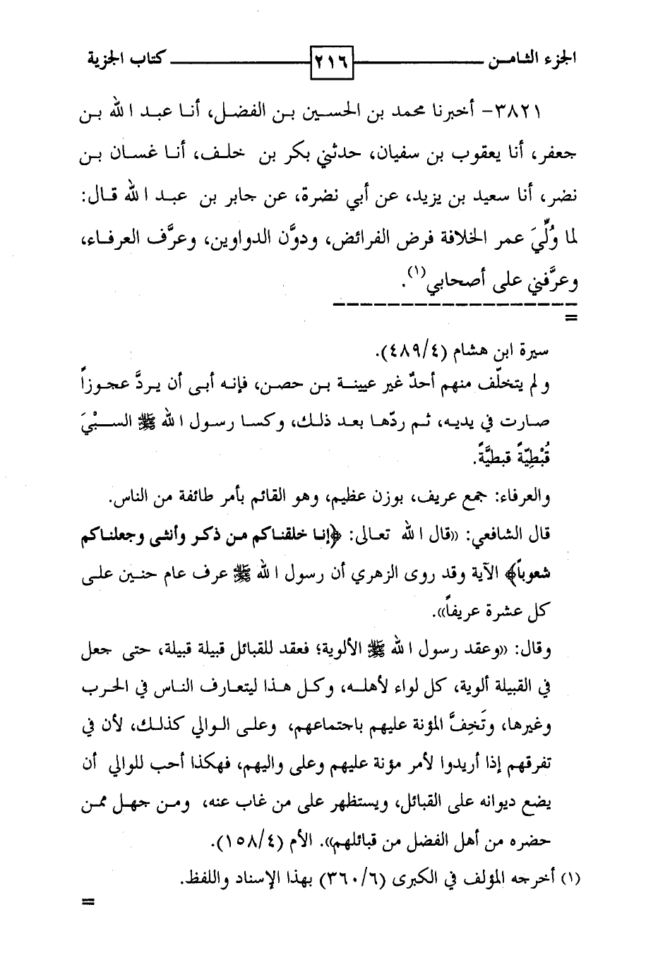 3821 - أخبرنا محمد بن الحسين بن الفضل ، أنا عبد الله بن جعفر ، أنا يعقوب بن سفيان ، حدثني بكر بن خلف ، أنا غسان بن نضر ، أنا سعيد بن يزيد ، عن أبي نضرة ، عن جابر بن عبد الله قال : لما ولي عمر الخلافة فرض الفرائض ، ودون الدواوين ، وعرف العرفاء ، وعرفني على أصحابي ( 1 ) .