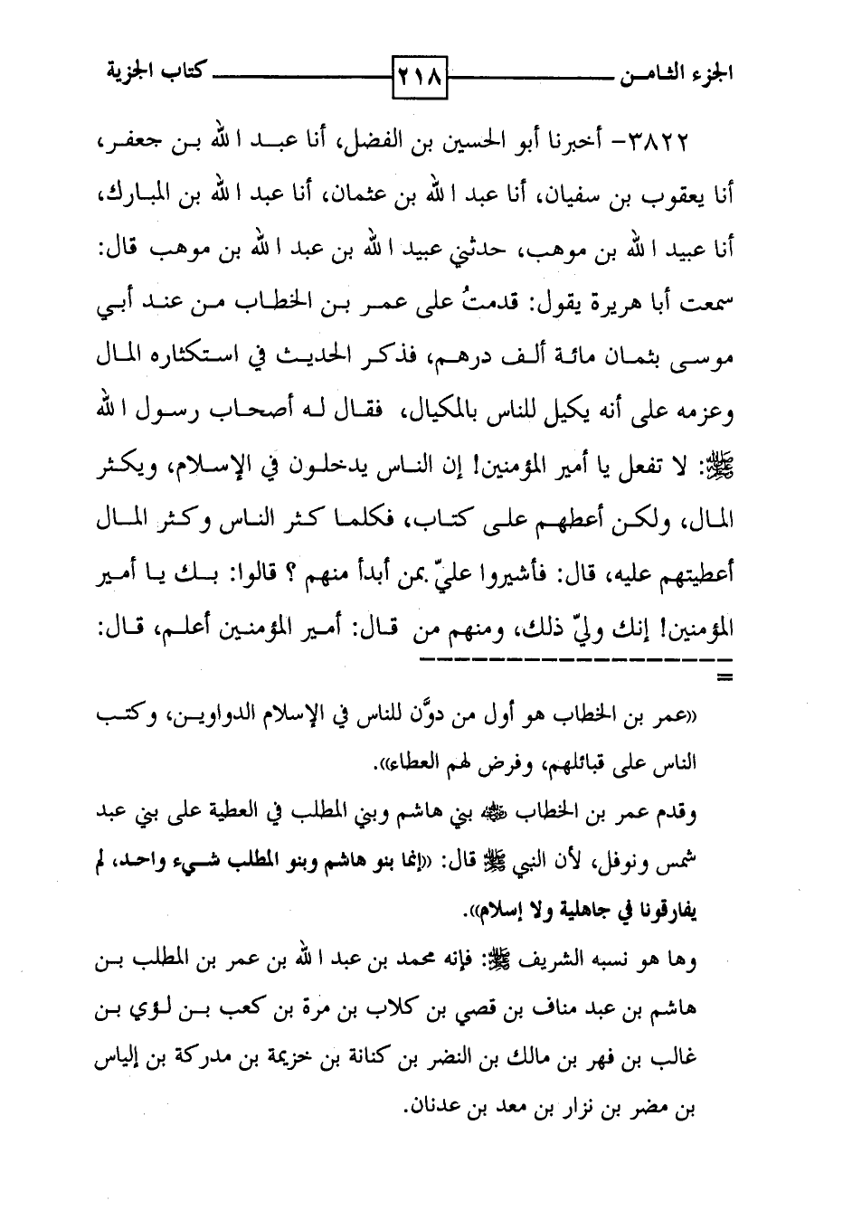 3822 - أخبرنا أبو الحسين بن الفضل ، أنا عبد الله بن جعفر ، أنا يعقوب بن سفيان ، أنا عبد الله بن عثمان ، أنا عبد الله بن المبارك ، أنا عبيد الله بن موهب ، حدثني عبيد الله بن عبد الله بن موهب قال : سمعت أبا هريرة يقول : قدمت على عمر بن الخطاب من عند أبي موسى بثمان مائة ألف درهم ، فذكر الحديث في استكثاره المال وعزمه على أنه يكيل للناس بالمكيال ، فقال له أصحاب رسول الله صلى الله عليه وسلم : لا تفعل يا أمير المؤمنين ! إن الناس يدخلون في الإسلام ، ويكثر المال ، ولكن أعطهم على كتاب ، فكلما كثر الناس وكثر المال أعطيتهم عليه ، قال : فأشيروا علي بمن أبدأ منهم ؟ قالوا : بك يا أمير المؤمنين ! إنك ولي ذلك ، ومنهم من قال : أمير المؤمنين أعلم ، قال :
