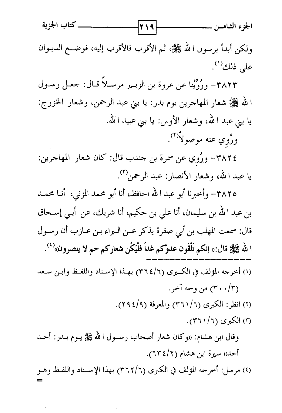 3823 - وروينا عن عروة بن الزبير مرسلاً قال : جعل رسول الله صلى الله عليه وسلم شعار المهاجرين يوم بدر : يا بني عبد الرحمن ، وشعار الخزرج : يا بني عبد الله ، وشعار الأوس : يا بني عبيد الله . وروي عنه موصولاً ( 2 ) .