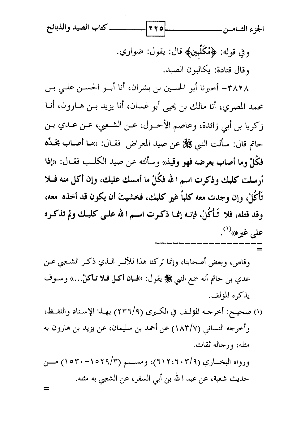 3828 - أخبرنا أبو الحسين بن بشران ، أنا أبو الحسن علي بن محمد المصري ، أنا مالك بن يحيى أبو غسان ، أنا يزيد بن هارون ، أنا زكريا بن أبي زائدة ، وعاصم الأحول ، عن الشعبي ، عن عدي بن حاتم قال : سألت النبي صلى الله عليه وسلم عن صيد المعراض فقال : ' ما أصاب بحده فكل وما أصاب بعرضه فهو قيذ ' وسألته عن صيد الكلب فقال : ' إذا أرسلت كلبك وذكرت اسم الله فكل ما امسك عليك ، وإن أكل منه فلا تأكل ، وإن وجدت معه كلباً غير كلبك ، فخشيت أن يكون قد أخذه معه ، وقد قتله ، فلا تأكل ، فإنه إنما ذكرت اسم الله على كلبك ولم تذكره على غيره ' ( 1 ) .