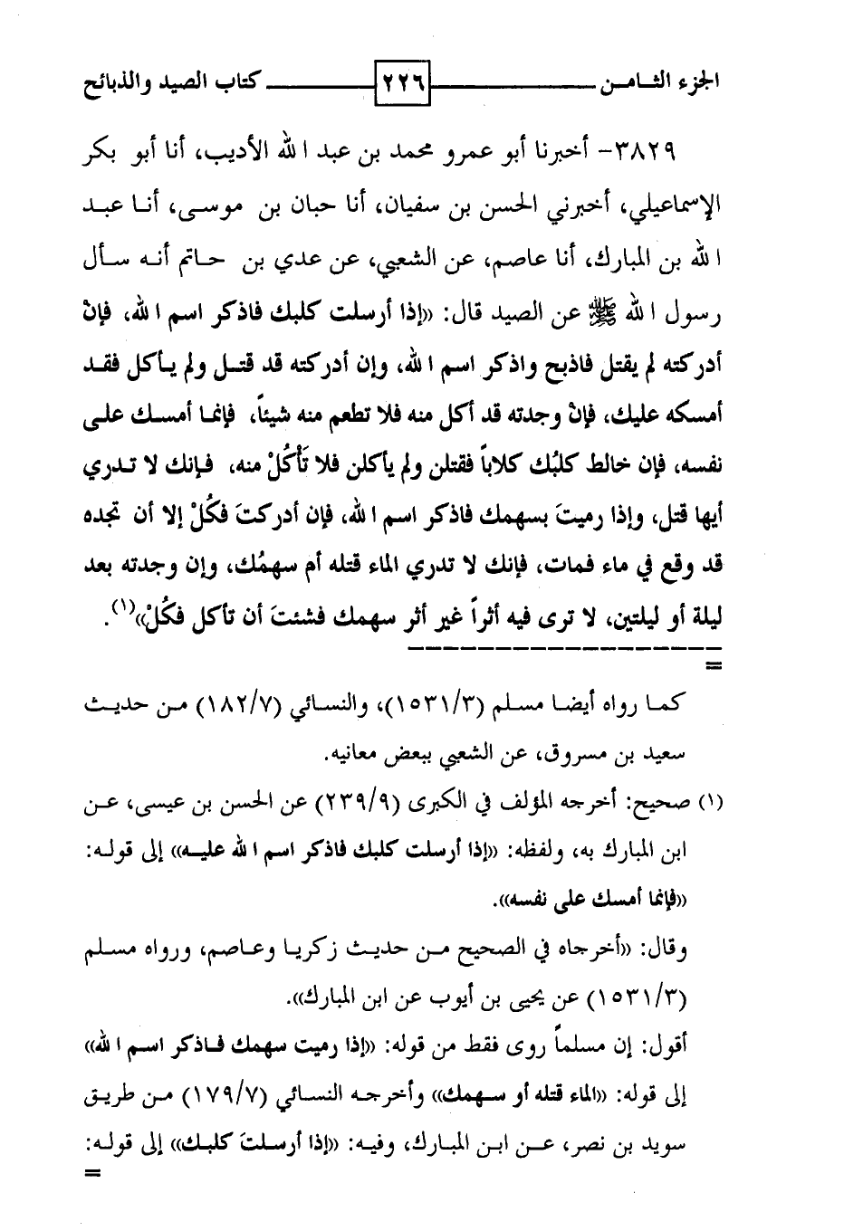 3829 - أخبرنا أبو عمرو محمد بن عبد الله الأديب ، أنا أبو بكر الإسماعيلي ، أخبرني الحسن بن سفيان ، أنا حبان بن موسى ، أنا عبد الله بن المبارك ، أنا عاصم ، عن الشعبي ، عن عدي بن حاتم أنه سأل رسول الله صلى الله عليه وسلم عن الصيد قال : ' إذا أرسلت كلبك فاذكر اسم الله ، فإن أدركته لم يقتل فاذبح واذكر اسم الله ، وإن أدركته قد قتل ولم يأكل فقد أمسكه عليك ، فإن وجدته قد أكل منه فلا تطعم منه شيئاً ، فإنما أمسك على نفسه ، فإن خالط كلبك كلاباً فقتلن ولم يأكلن فلا تأكل منه ، فإنك لا تدري أيها قتل ، وإذا رميت بسهمك فاذكر اسم الله ، فإن أدركت فكل إلا أن تجده قد وقع في ماء فمات ، فإنك لا تدري الماء قتله أم سهمك ، وإن وجدته بعد ليلة أو ليلتين ، لا ترى فيه أثراً غير أثر سهمك فشئت أن تأكل فكل ' ( 1 ) .