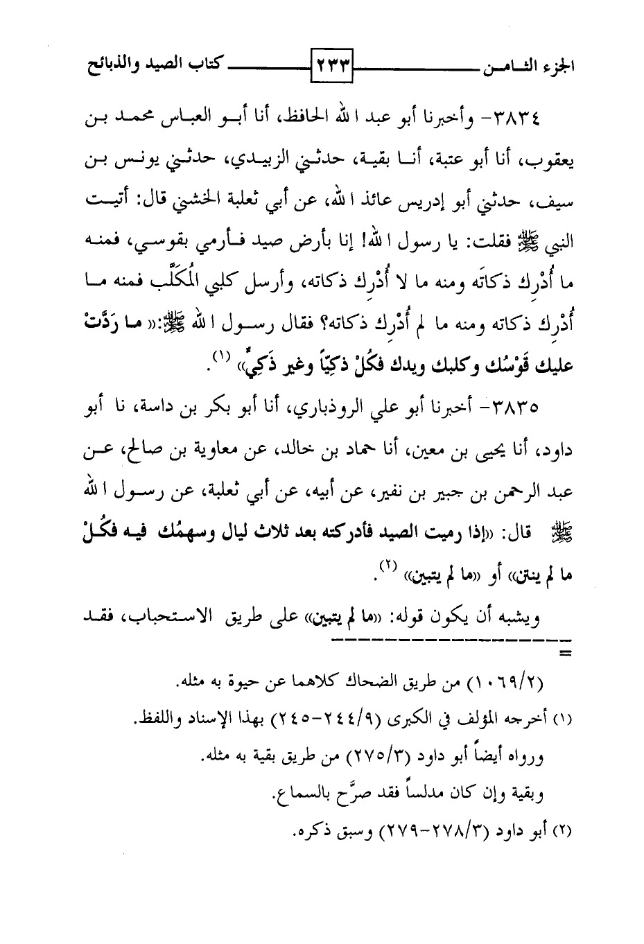 3835 - أخبرنا أبو علي الروذباري ، أنا أبو بكر بن داسة ، نا أبو داود ، أنا يحيى بن معين ، أنا حماد بن خالد ، عن معاوية بن صالح ، عن عبد الرحمن بن جبير بن نفير ، عن أبيه ، عن أبي ثعلبة ، عن رسول الله صلى الله عليه وسلم قال : ' إذا رميت الصيد فأدركته بعد ثلاث ليال وسهمك فيه فكل ما لم ينتن ' أو ' ما لم يتبين ' ( 2 ) . ويشبه ان يكون قوله : ' ما لم يتبين ' على طريق الاستحباب ، فقد
