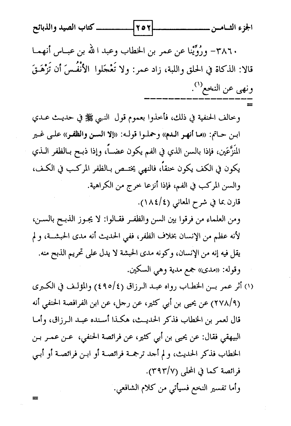 3860 - وروينا عن عمر بن الخطاب وعبد الله بن عباس أنهما قالا : الذكاة في الحلق واللبة ، زاد عمر : ولا تعجلوا الأنفس أن تزهق ونهى عن النخع ( 1 ) .