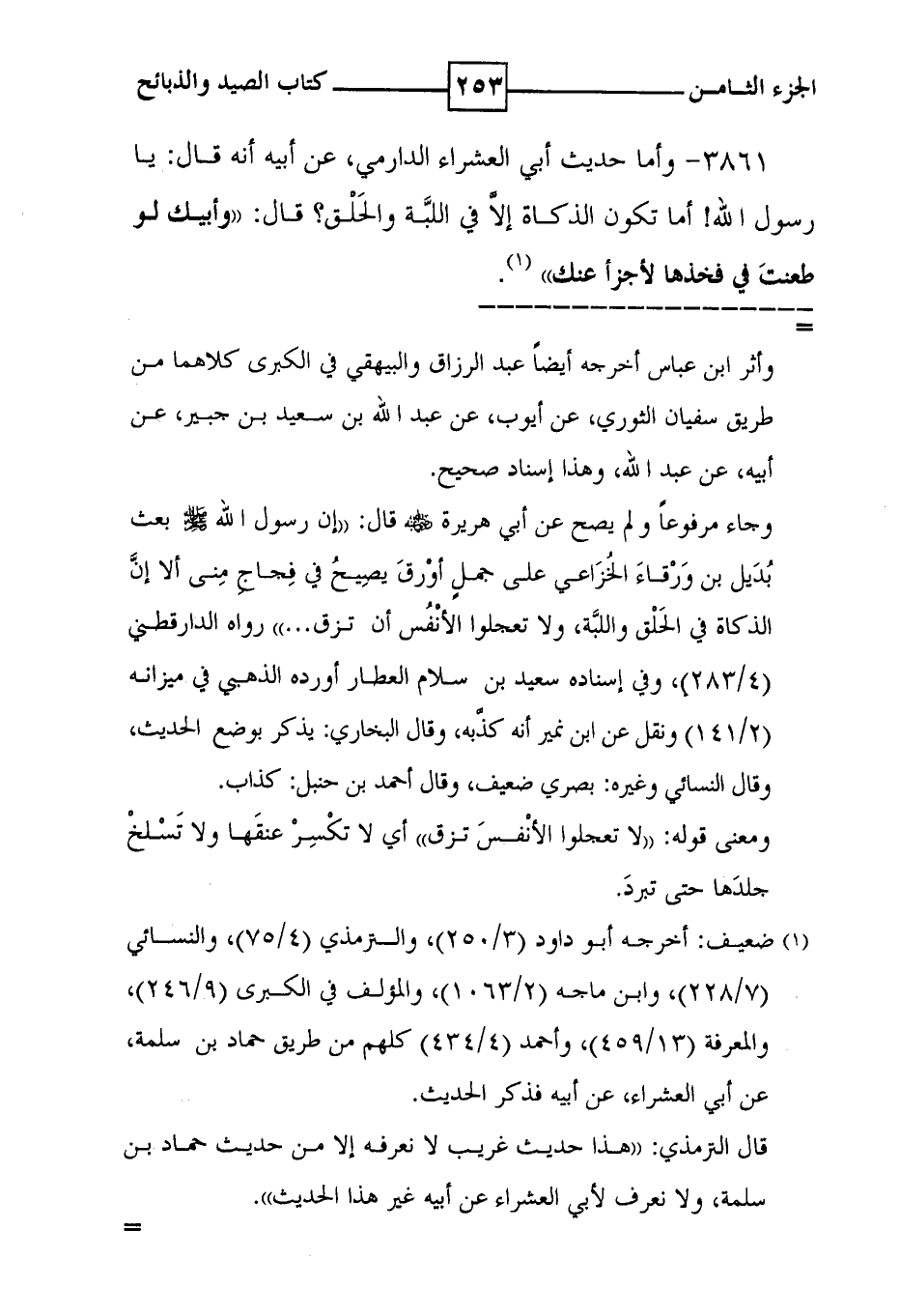 3861 - وأما حديث أبي العشراء الدارمي ، عن أبيه أنه قال : يا رسول الله ! أما تكون الذكاة إلا في اللبة والحلق ؟ قال : ' وأبيك لو طعنت في فخذها لأجزأ عنك ' ( 1 ) .