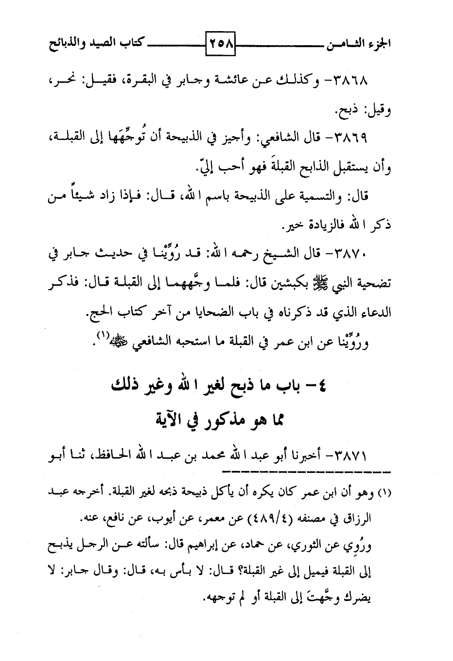 3870 - قال الشيخ رحمه الله : قد روينا في حديث جابر في تضحية النبي صلى الله عليه وسلم بكبشين قال : فلما وجههما إلى القبلة قال : فذكر الدعاء الذي قد ذكرناه في باب الضحايا من آخر كتاب الحج . وروينا عن ابن عمر في القبلة ما استحبه الشافعي رضي الله عنه ( 1 ) . 4 - باب ما ذبح لغير الله وغير ذلك مما هو مذكور في الآية