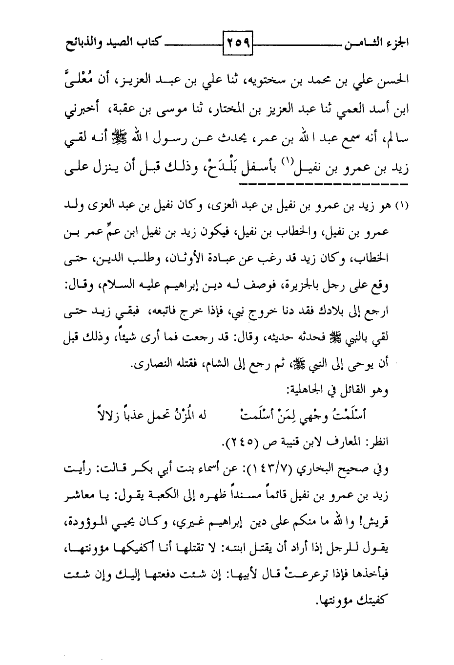 الحسن علي بن محمد بن سختويه ، ثنا علي بن عبد العزيز ، أن معلى ابن أسد العمي ثنا عبد العزيز بن المختار ، ثنا موسى بن عقبة ، أخبرني سالم ، أنه سمع عبد الله بن عمر ، يحدث عن رسول الله صلى الله عليه وسلم أنه لقي زيد بن عمرو بن نفيل ( 1 ) بأسفل بلدح ، وذلك قبل أن ينزل على