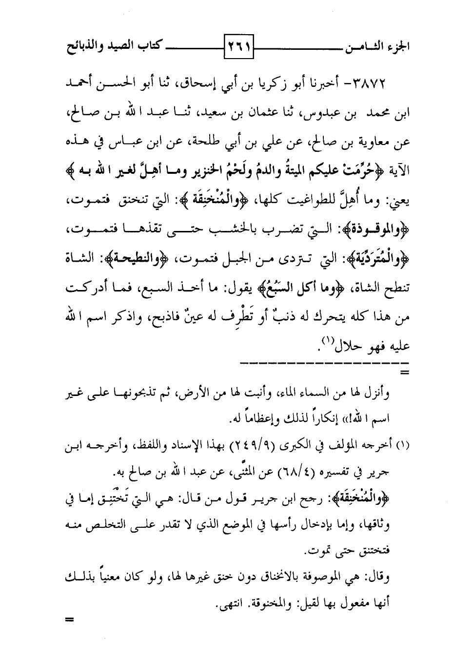 3872 - أخبرنا أبو زكريا بن أبي إسحاق ، ثنا أبو الحسن أحمد ابن محمد بن عبدوس ، ثنا عثمان بن سعيد ، ثنا عبد الله بن صالح ، عن معاوية بن صالح ، عن علي بن أبي طلحة ، عن ابن عباس في هذه الآية : ! ( حرمت عليكم الميتة والدم ولحم الخنزير وما أهل لغير الله به ) ! يعني : وما أهل للطواغيت كلها ، ! ( والمنخنقة ) ! : التي تنخنق فتموت ، ! ( والموقوذة ) ! : التي تضرب بالخشب حتى تقذها فتموت ، ! ( المتردية ) ! : التي تتردى من الجبل فتموت ، ! ( والنطيحة ) ! : الشاة تنطح الشاة ، ! ( وما أكل السبع ) ! يقول : ما أخذ السبع ، فما أدركت من هذا كله يتحرك له ذنب أو تطرف له عين فاذبح ، واذكر اسم الله عليه فهو حلال ( 1 ) .