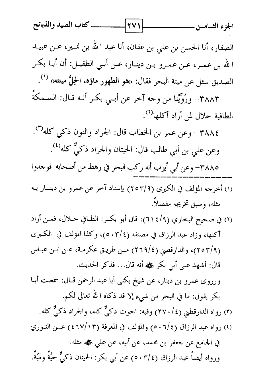 3884 - وعن عمر بن الخطاب قال : الجراد والنون ذكي كله . وعن علي بن أبي طالب قال : الحيتان والجراد ذكي كله ( 4 ) .