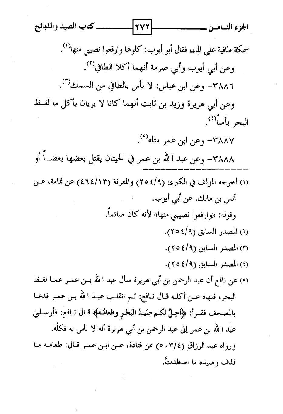 3886 - وعن ابن عباس : لا بأس بالطافي من السمك ( 3 ) . وعن أبي هريرة وزيد بن ثابت أنهما كانا لا يريان بأكل ما لفظ البحر بأساً ( 4 ) .