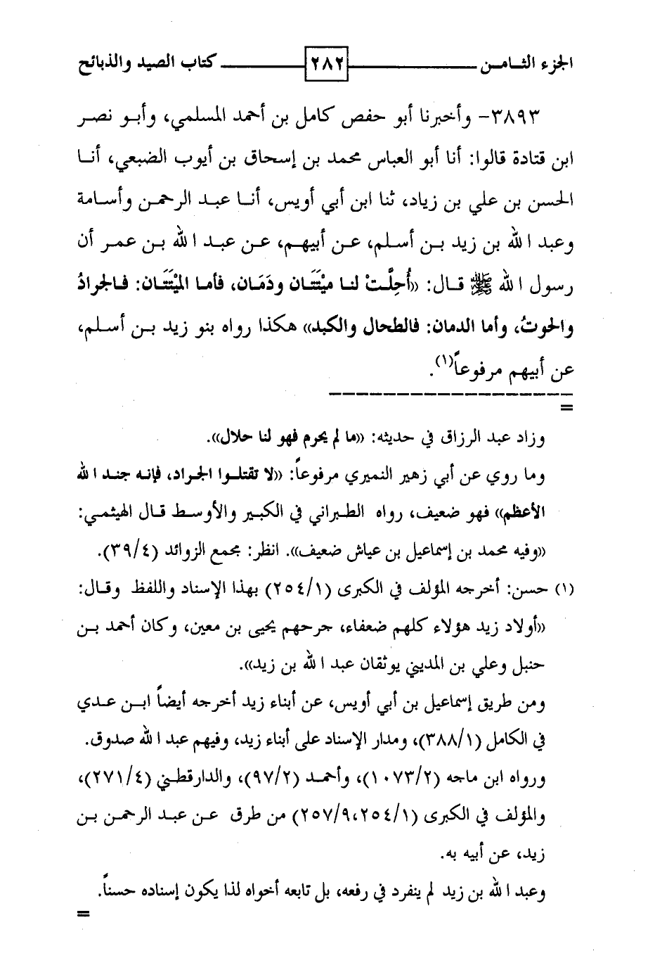 3893 - وأخبرنا أبو حفص كامل بن أحمد المسلمي ، وأبو نصر ابن قتادة قالوا : أنا أبو العباس محمد بن إسحاق بن أيوب الضبعي ، أنا الحسن بن علي بن زياد ، ثنا ابن أبي أويس ، أنا عبد الرحمن وأسامة وعبد الله بن زيد بن أسلم ، عن أبيهم ، عن عبد الله بن عمر أن رسول الله صلى الله عليه وسلم قال : ' أحلت لكم ميتتان ودمان ، فأما الميتتان : الجراد والحوت ، وأما الدمان : فالطحال والكبد ' هكذا رواه بنو زيد بن أسلم ، عن أبيهم مرفوعاً ( 1 ) .