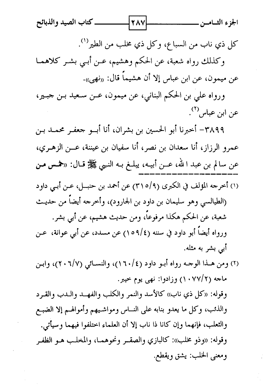 كل ذي ناب من السباع ، وكل ذي مخلب من الطير ( 1 ) . وكذلك رواه شعبة ، عن الحكم وهشيم ، عن أبي بشر كلاهما عن ميمون ، عن ابن عباس إلا أن هشيماً قال : ' نهى ' . ورواه علي بن الحكم البناني ، عن ميمون ، عن سعيد بن جبير ، عن ابن عباس ( 2 ) .