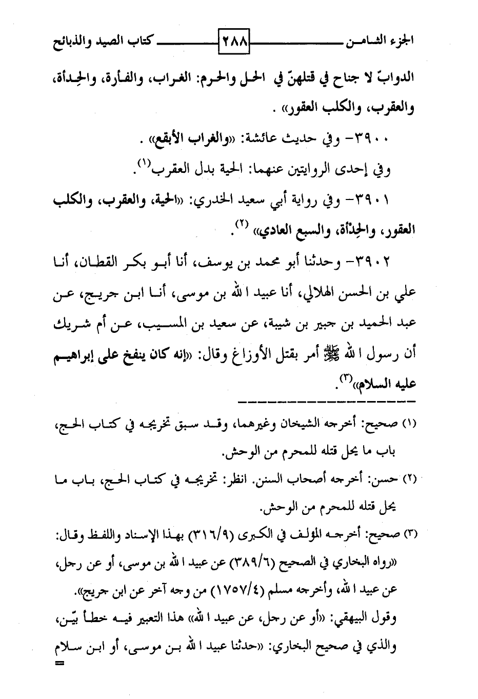 3900 - وفي حديث عائشة : ' والغراب الأبقع ' . وفي إحدى الروايتين عنهما : الحية بدل العقرب ( 1 ) .