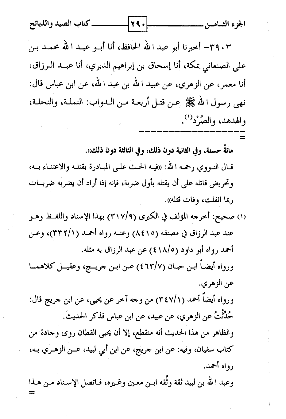 3903 - أخبرنا أبو عبد الله الحافظ ، أنا أبو عبد الله محمد بن علي الصنعاني بمكة ، أنا إسحاق بن إبراهيم الدبري ، أنا عبد الرزاق ، أنا معمر ، عن الزهري ، عن عبيد الله بن عبد الله ، عن ابن عباس قال : أنا معمر ، عن الزهري ، عن عبيد الله بن عبد الله ، عن ابن عباس قال : نهى رسول الله صلى الله عليه وسلم عن قتل أربعة من الدواب : النملة ، والنحلة ، والهدهد ، والصرد ( 1 ) .