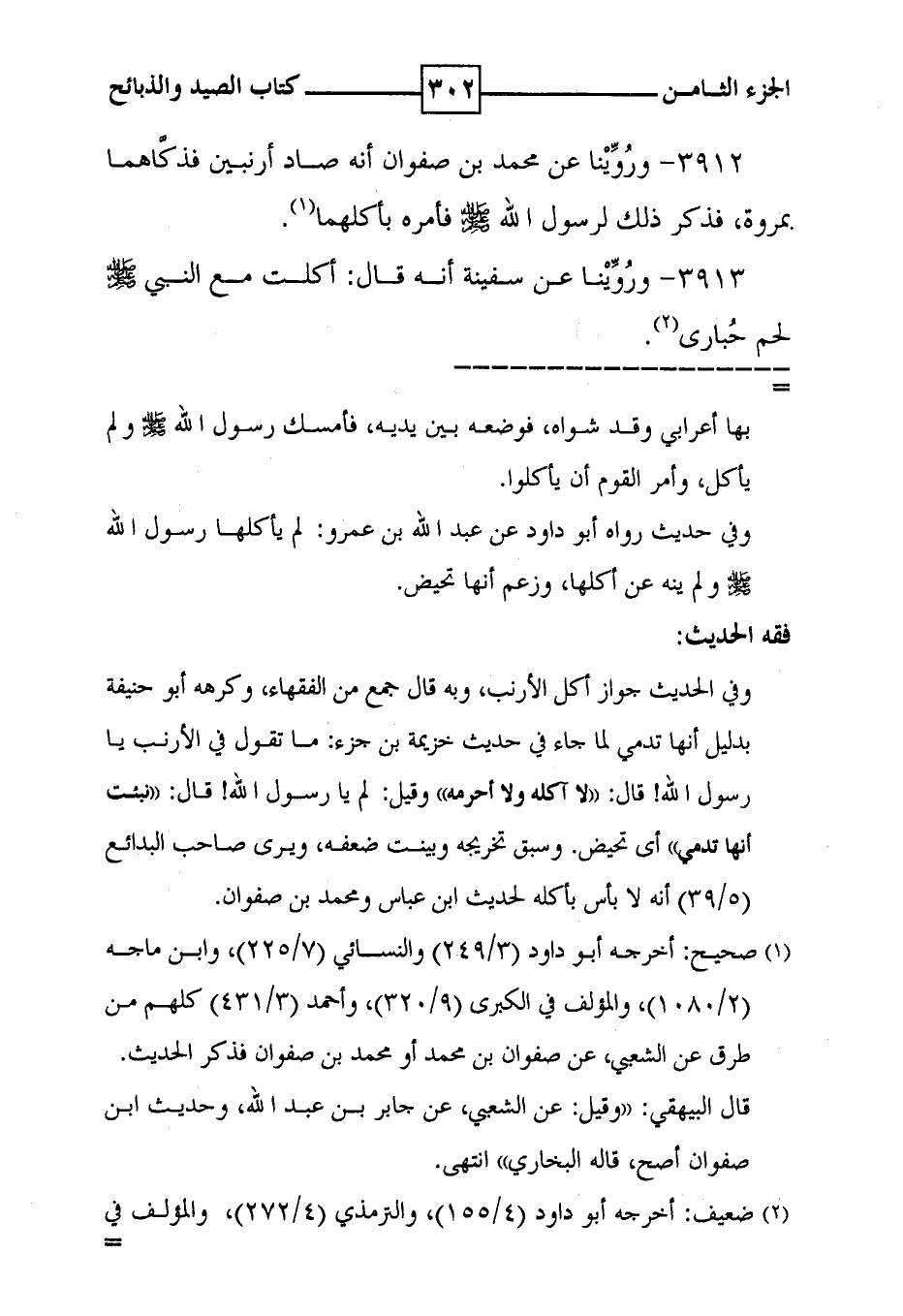 3912 - وروينا عن محمد بن صفوان أنه صاد أرنبين فذكاهما بمروة ، فذكر ذلك لرسول الله صلى الله عليه وسلم فأمره بأكلهما ( 1 ) .