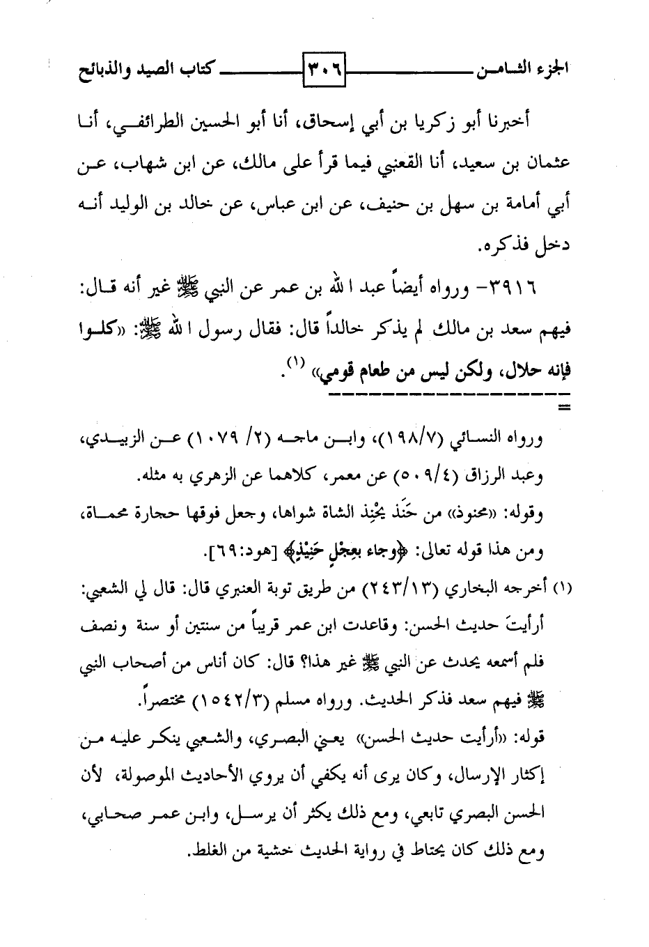 3916 - ورواه أيضاً عبد الله بن عمر عن النبي صلى الله عليه وسلم غير أنه قال : فيهم سعد بن مالك لم يذكر خالداً ، قال : فقال رسول الله صلى الله عليه وسلم : ' كلوا فإنه حلال ، ولكن ليس من طعام قومي ' ( 1 ) .
