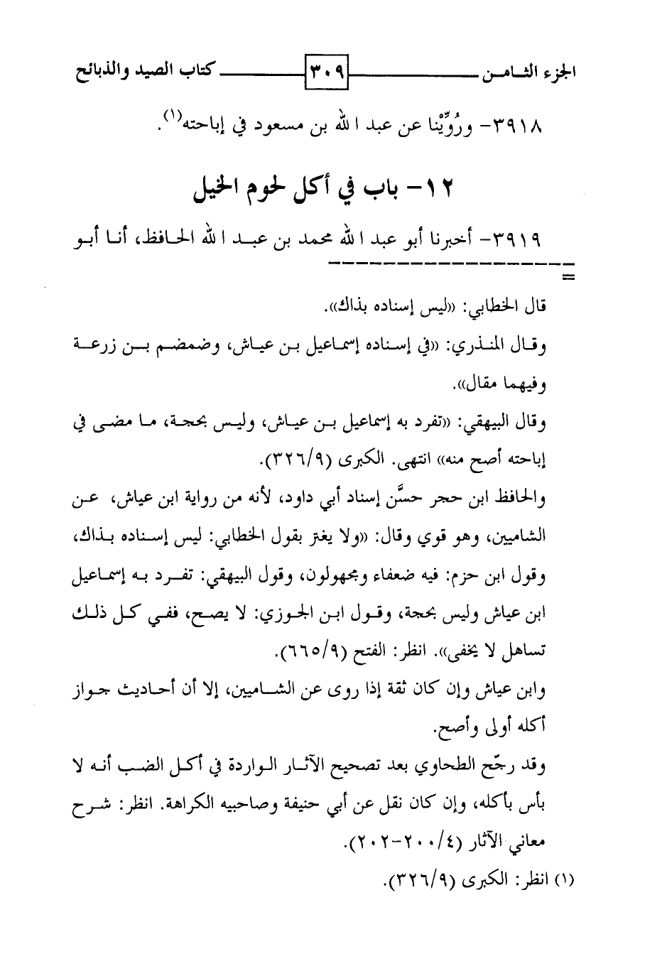3918 - وروينا عن عبد الله بن مسعود في إباحته ( 1 ) . 12 - باب في أكل لحوم الخيل