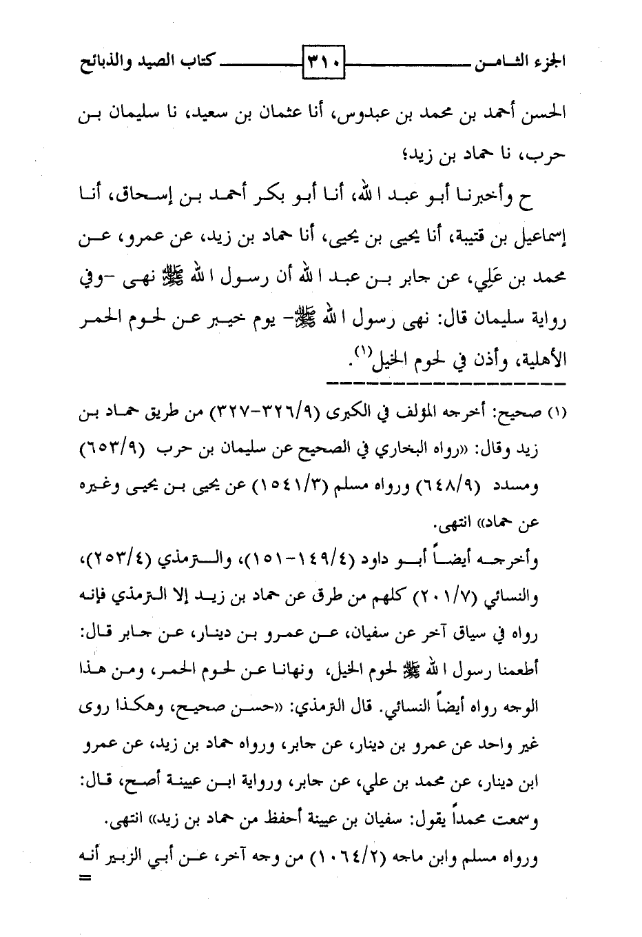 الحسن أحمد بن محمد بن عبدوس ، أنا عثمان بن سعيد ، نا سليمان بن حرب ، نا حماد بن زيد ؛ ح وأخبرنا أبو عبد الله ، أنا أبو بكر أحمد بن إسحاق ، أنا إسماعيل بن قتيبة ، أنا يحيى بن يحيى ، أنا حماد بن زيد ، عن عمرو ، عن محمد بن علي ، عن جابر بن عبد الله أن رسول الله صلى الله عليه وسلم نهى - وفي رواية سليمان قال : نهى رسول الله صلى الله عليه وسلم - يوم خيبر عن لحوم الحمر الأهلية ، وأذن في لحوم الخيل ( 1 ) .