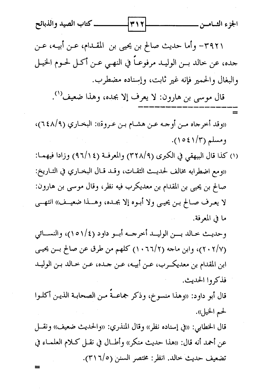3921 - وأما حديث صالح بن يحيى بن المقدام ، عن أبيه ، عن جده عن خالد بن الوليد ، مرفوعاً في النهي عن أكل لحوم الخيل والبغال والحمير فإنه غير ثابت ، وإسناده مضطرب . قال موسى بن هارون : لا يعرف إلا بجده ، وهذا ضعيف ( 1 ) .