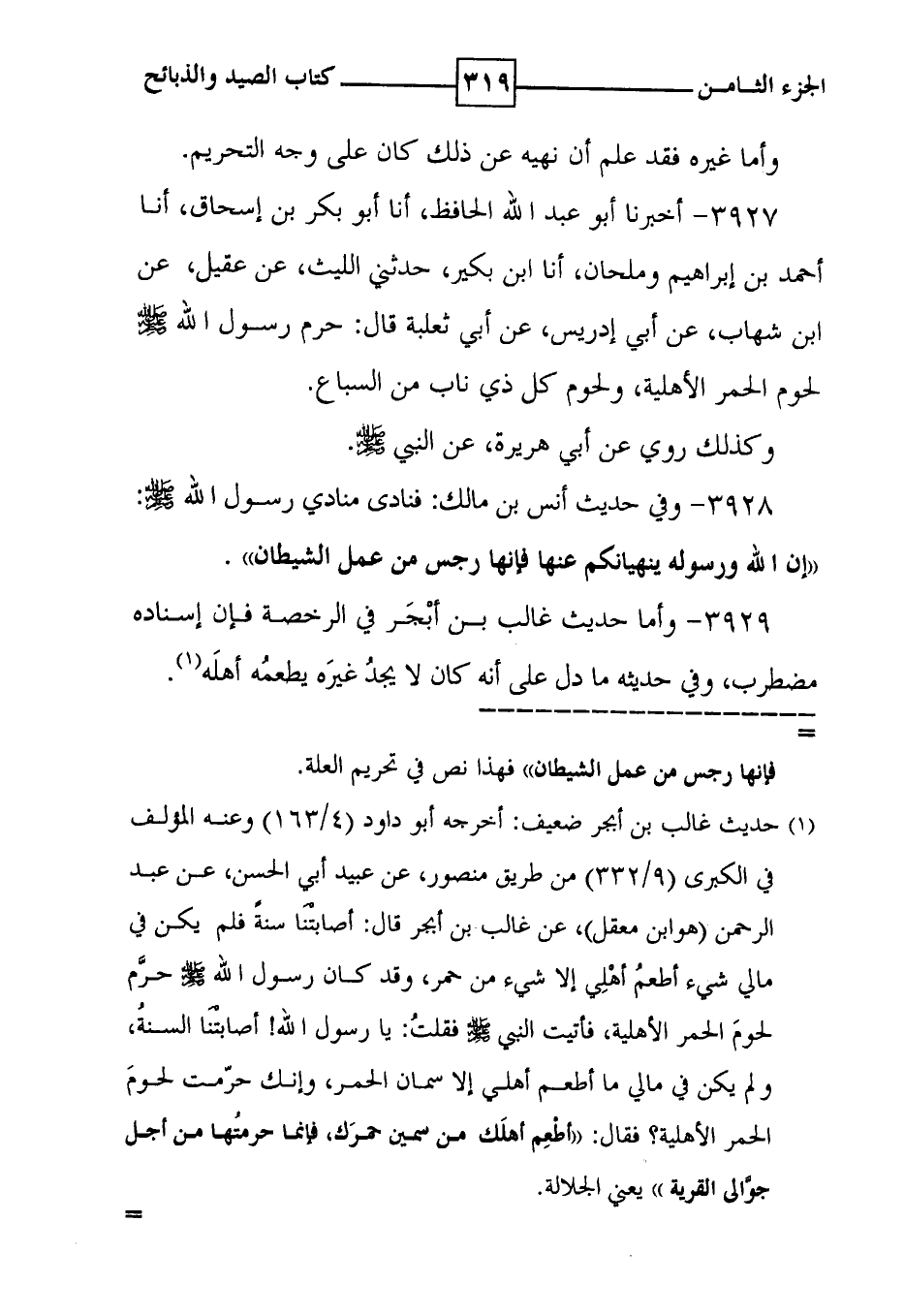 3929 - وأما حديث غالب بن أبجر في الرخصة فإن إسناده مضطرب ، وفي حديثه ما دل على أنه كان لا يجد غيره يطعمه أهله ( 1 ) .