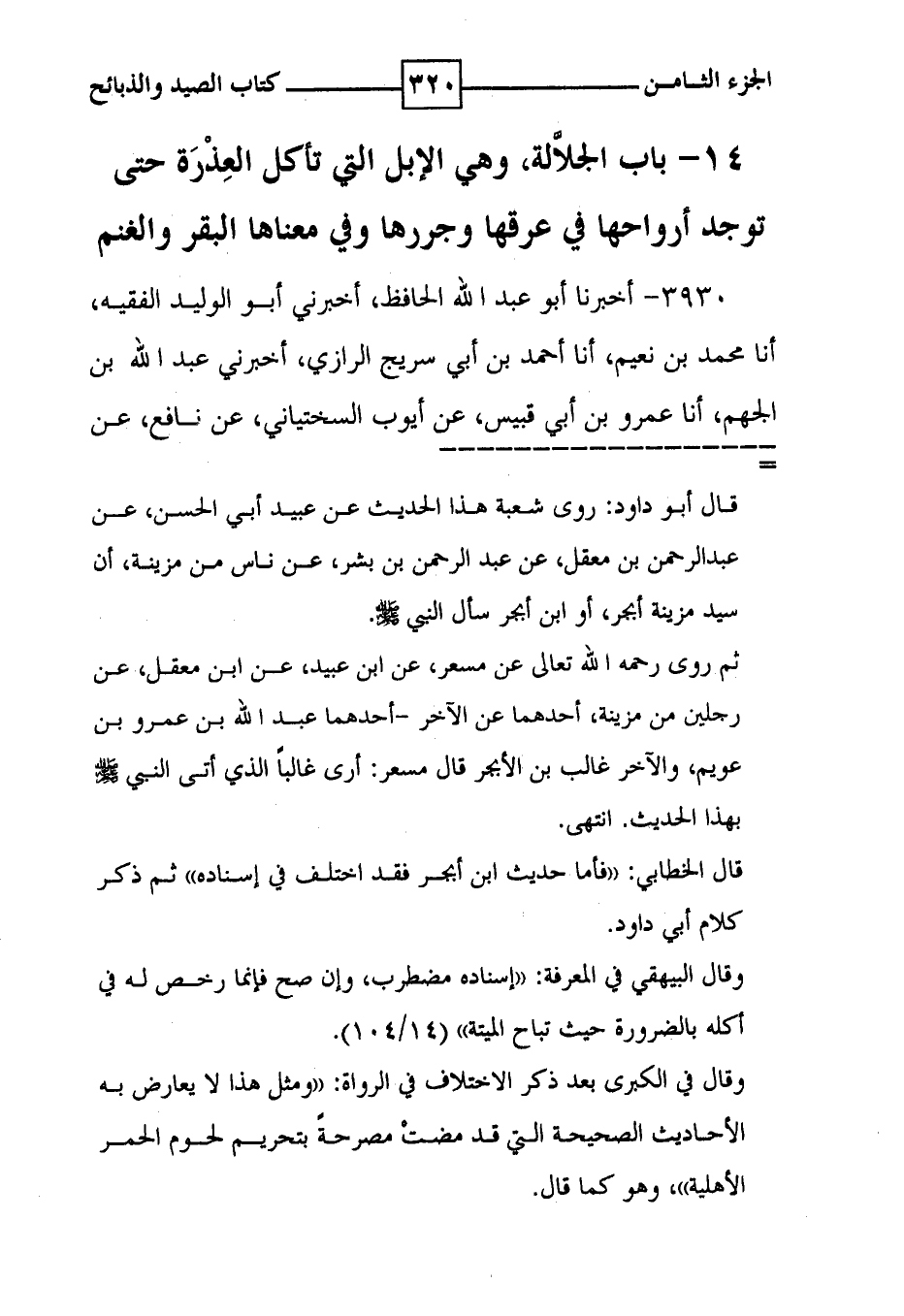 14 - باب الجلاًّلة ، وهي الإبل التي تأكل العِذرة حتى توجد أرواحها في عرقها وجررها وفي معناها البقر والغنم