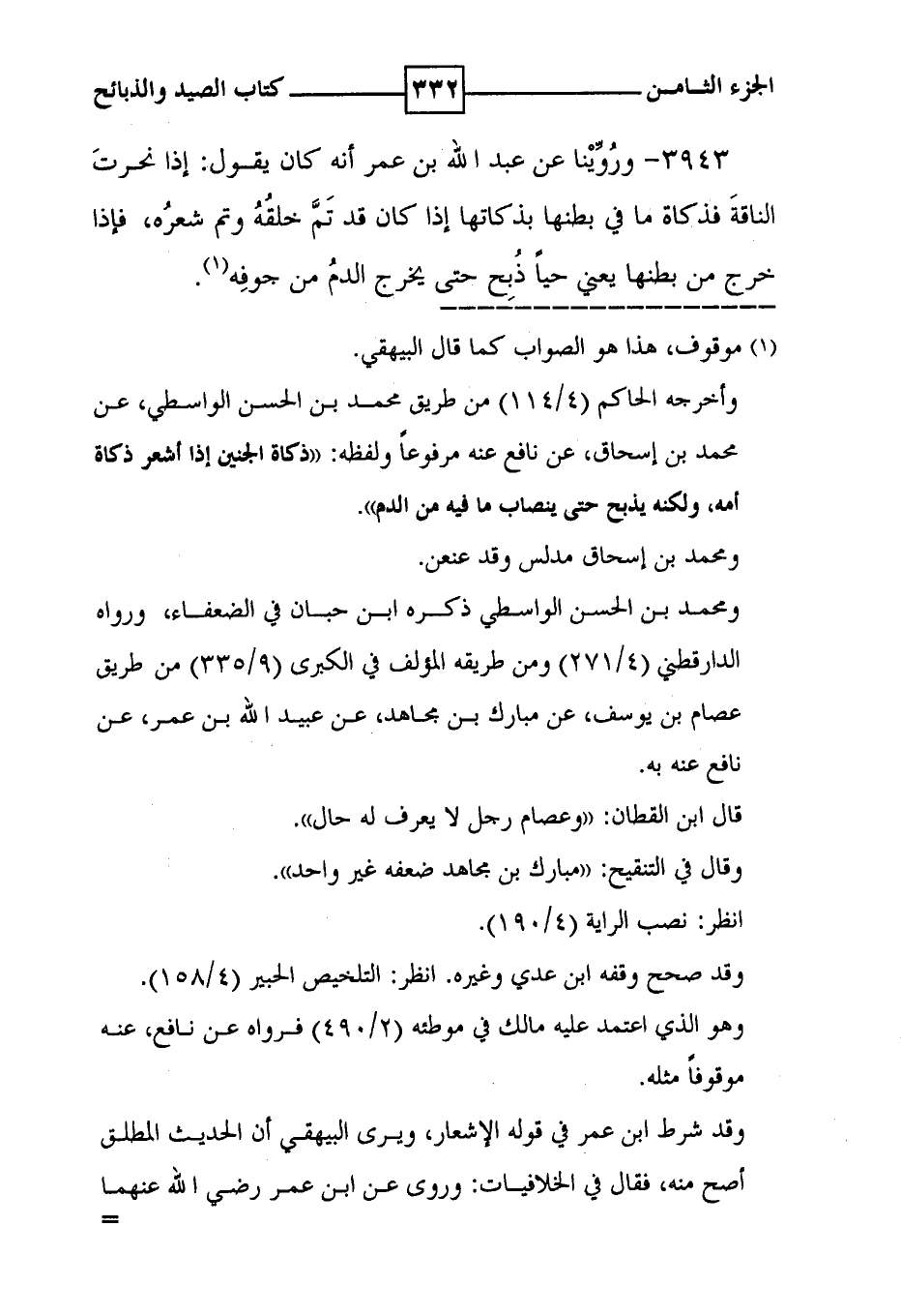 3943 - وروينا عن عبد الله بن عمر أنه كان يقول : إذا نحرت الناقة فذكاة ما في بطنها بذكاتها إذا كان قد تم خلقه وتم شعره ، فإذا خرج من بطنها يعني حياً ذبح حتى يخرج الدم من جوفه ( 1 ) .