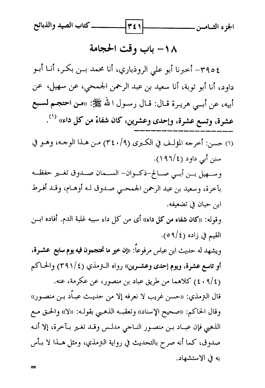 3954 - أخبرنا أبو علي الروذباري ، أنا محمد بن بكر ، أنا أبو داود ، أنا أبو توبة ، أنا سعيد بن عبد الرحمن الجمحي ، عن سهيل ، عن أبيه ، عن أبي هريرة قال : قال رسول الله صلى الله عليه وسلم : ' من احتجم لسبع عشرة ، وتسع عشرة ، وإحدى وعشرين ، كان شفاء من كل داء ' ( 1 ) .