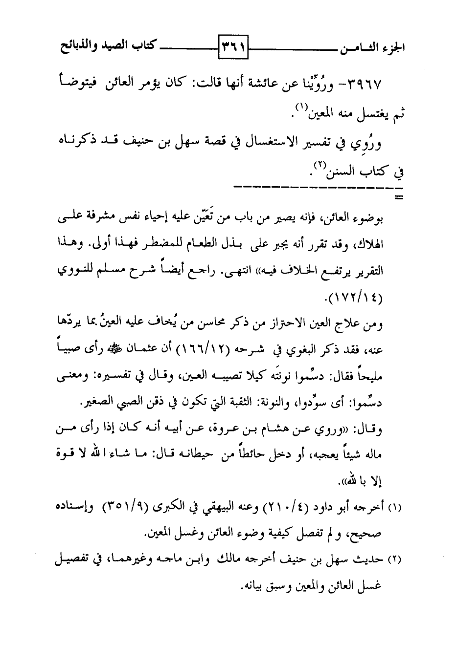 3967 - وروينا عن عائشة أنها قالت : كان يؤمر العائن فيتوضأ ثم يغتسل منه المعين ( 1 ) . وروي في تفسير الاستغسال في قصة سهل بن حنيف قد ذكرناه في كتاب السنن ( 2 ) .