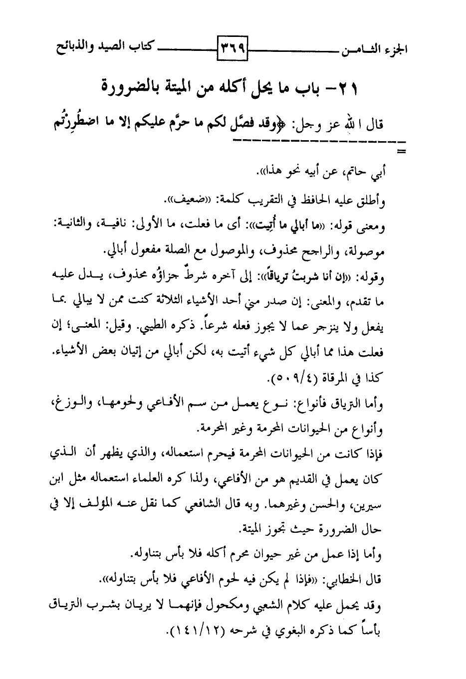 21 - باب ما يحل أكله من الميتة بالضرورة قال الله عز وجل : ' وقد فصل لكم ما حرم عليكم إلا ما اضطررتم