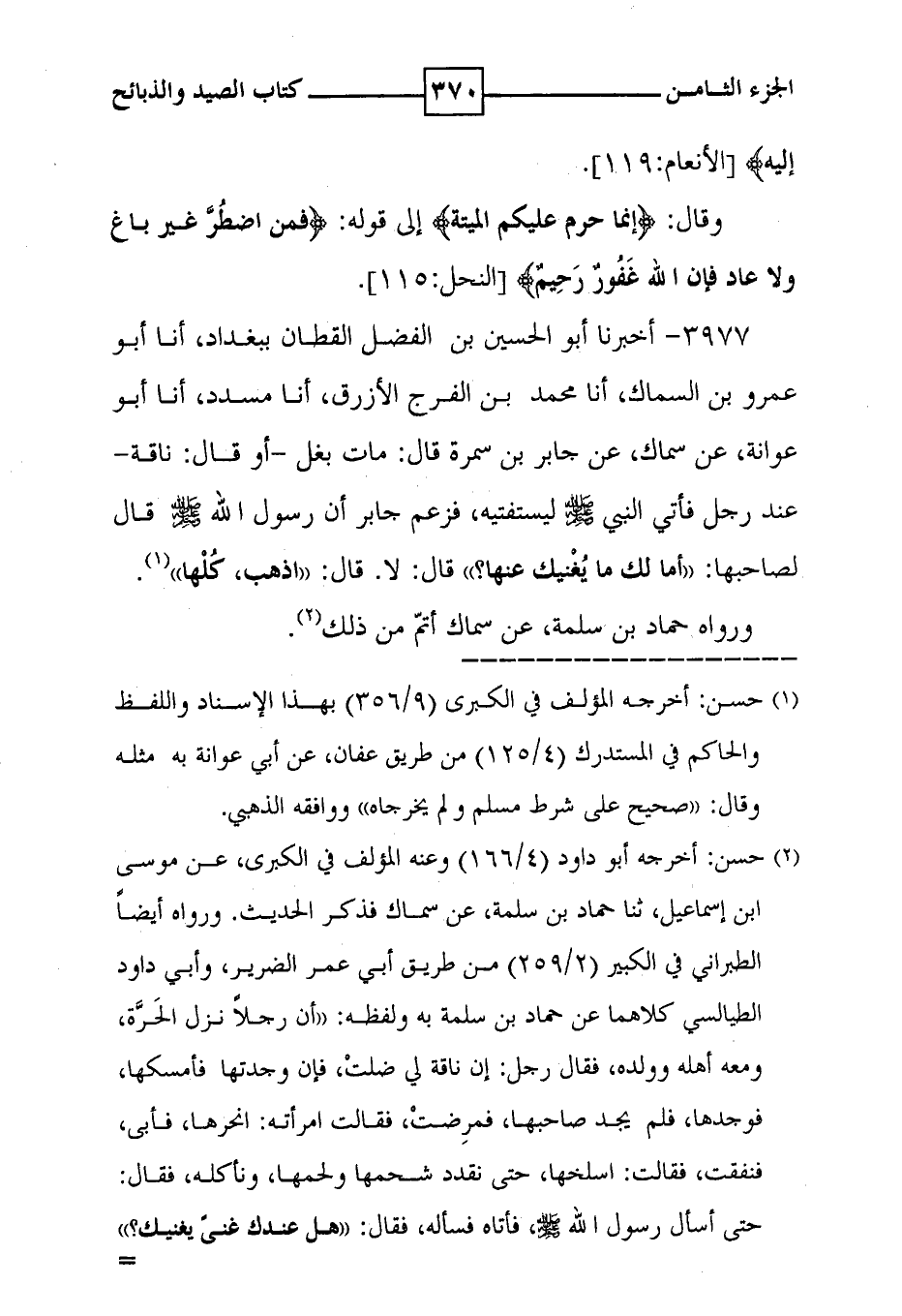 3977 - أخبرنا أبو الحسين بن الفضل القطان ببغداد ، أنا أبو عمرو بن السماك ، أنا محمد بن الفرج الأزرق ، أنا مسدد ، أنا أبو عوانة ، عن سماك ، عن جابر بن سمرة قال : مات بغل - أو قال : ناقة - عند رجل فأتي النبي صلى الله عليه وسلم ليستفتيه ، فزعم جابر أن رسول الله صلى الله عليه وسلم قال لصاحبها : ' أما لك ما يغنيك عنها ؟ ' قال : لا . قال : ' اذهب ، كلها ' ( 1 ) . ورواه حماد بن سلمة ، عن سماك أتم من ذلك ( 2 ) .
