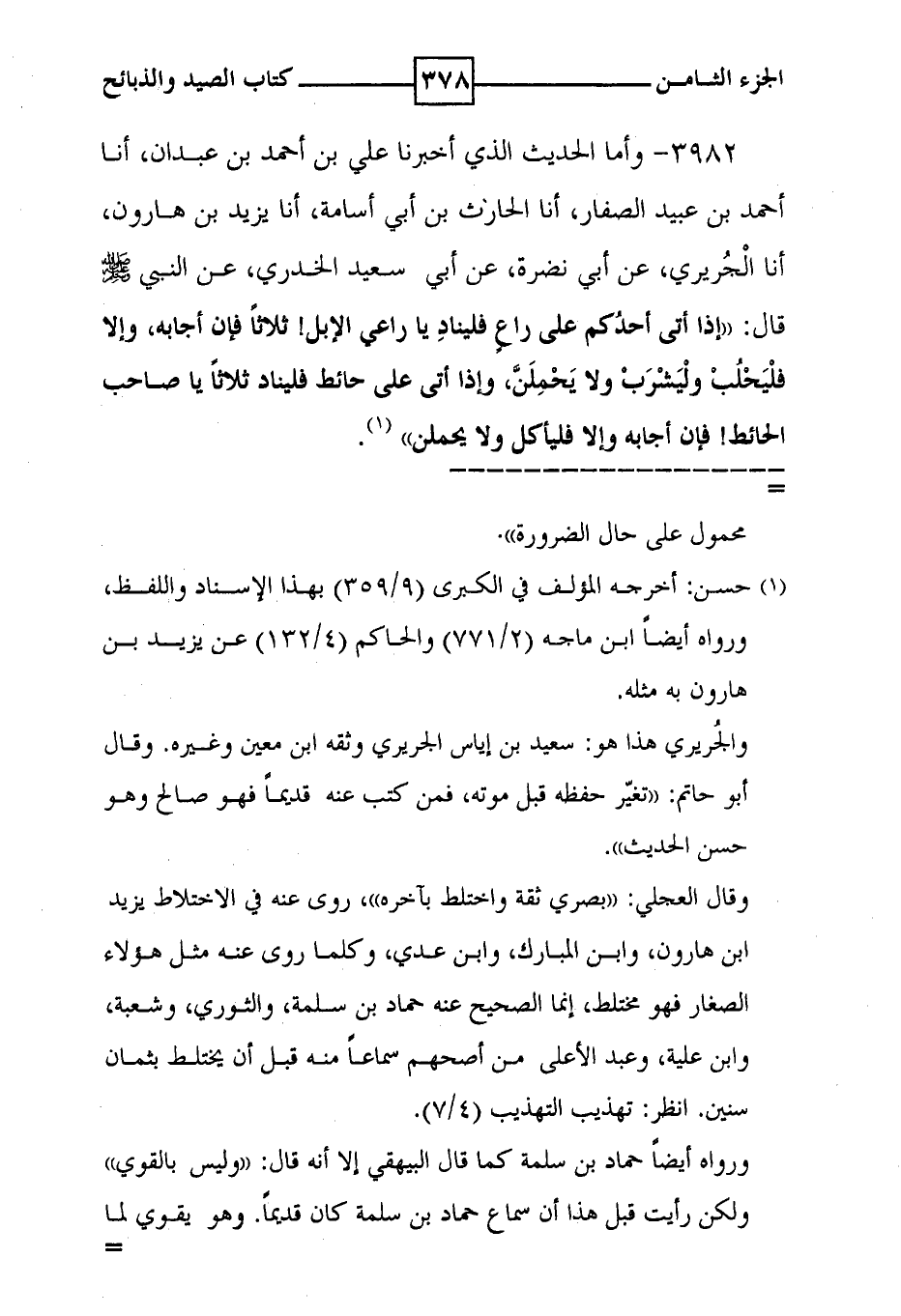 3982 - وأما الحديث الذي أخبرنا علي بن أحمد بن عبدان ، أنا أحمد بن عبيد الصفار ، أنا الحارث بن أبي أسامة ، أنا يزيد بن هارون ، أنا الجريري ، عن أبي نضرة ، عن أبي سعيد الخدري ، عن النبي صلى الله عليه وسلم قال : ' إذا أتى أحدكم على راع فليناد يا راعي اللإبل ! ثلاثاً فإن أجابه ، وإلا فليحلب وليشرب ولا يحملن ، وإذا أتى على حائط فليناد ثلاثاً يا صاحب الحائط ! فإن أجابه وإلا فليأكل ولا يحملن ' ( 1 ) .