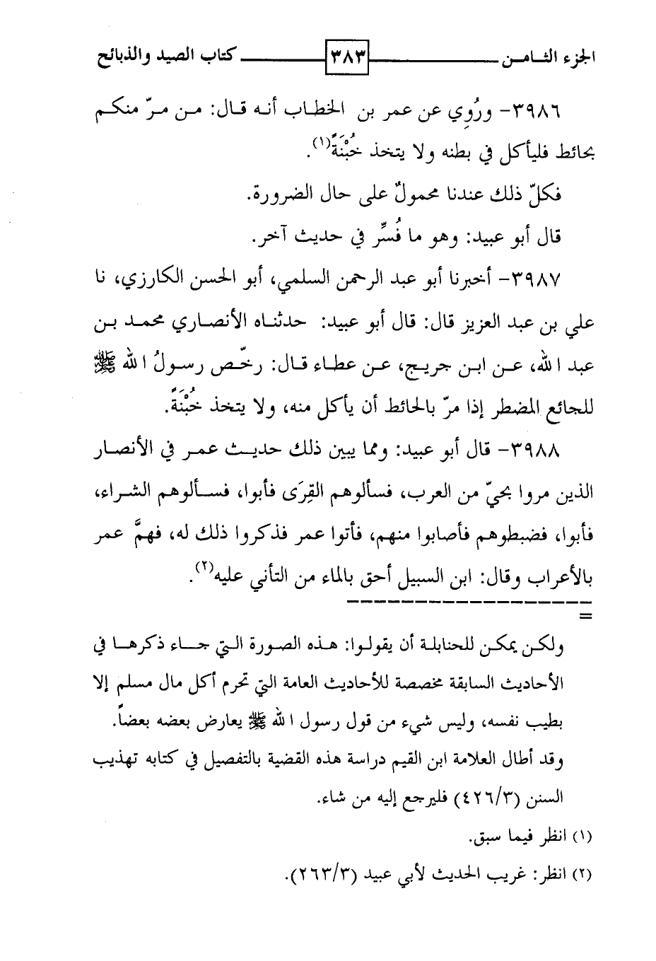 3986 - وروي عن عمر بن الخطاب أنه قال : من مر منكم بحائط فليأكل في بطنه ولا يتخذ خبنة ( 1 ) . فكل ذلك عندنا محمول على حال الضرورة . قال أبو عبيد : وهو ما فسر في حديث آخر .