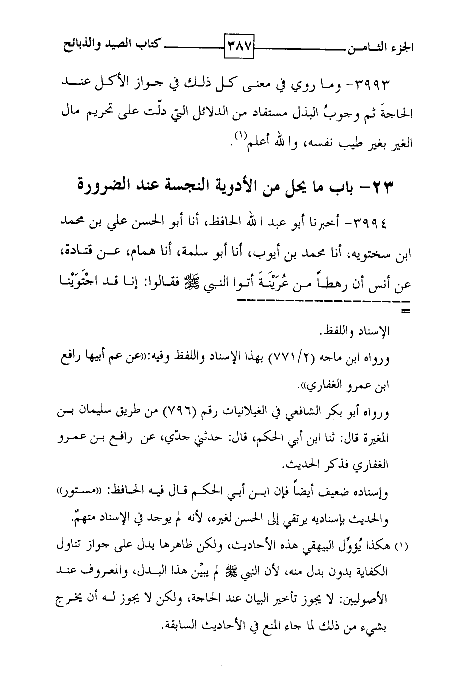 3993 - وما روي في معنى كل ذلك في جواز الأكل عند الحاجة ثم وجوب البذل مستفاد من الدلائل التي دلت على تحريم مال الغير بغير طيب نفسه ، والله أعلم ( 1 ) . 23 - باب ما يحل من الأدوية النجسة عند الضرورة