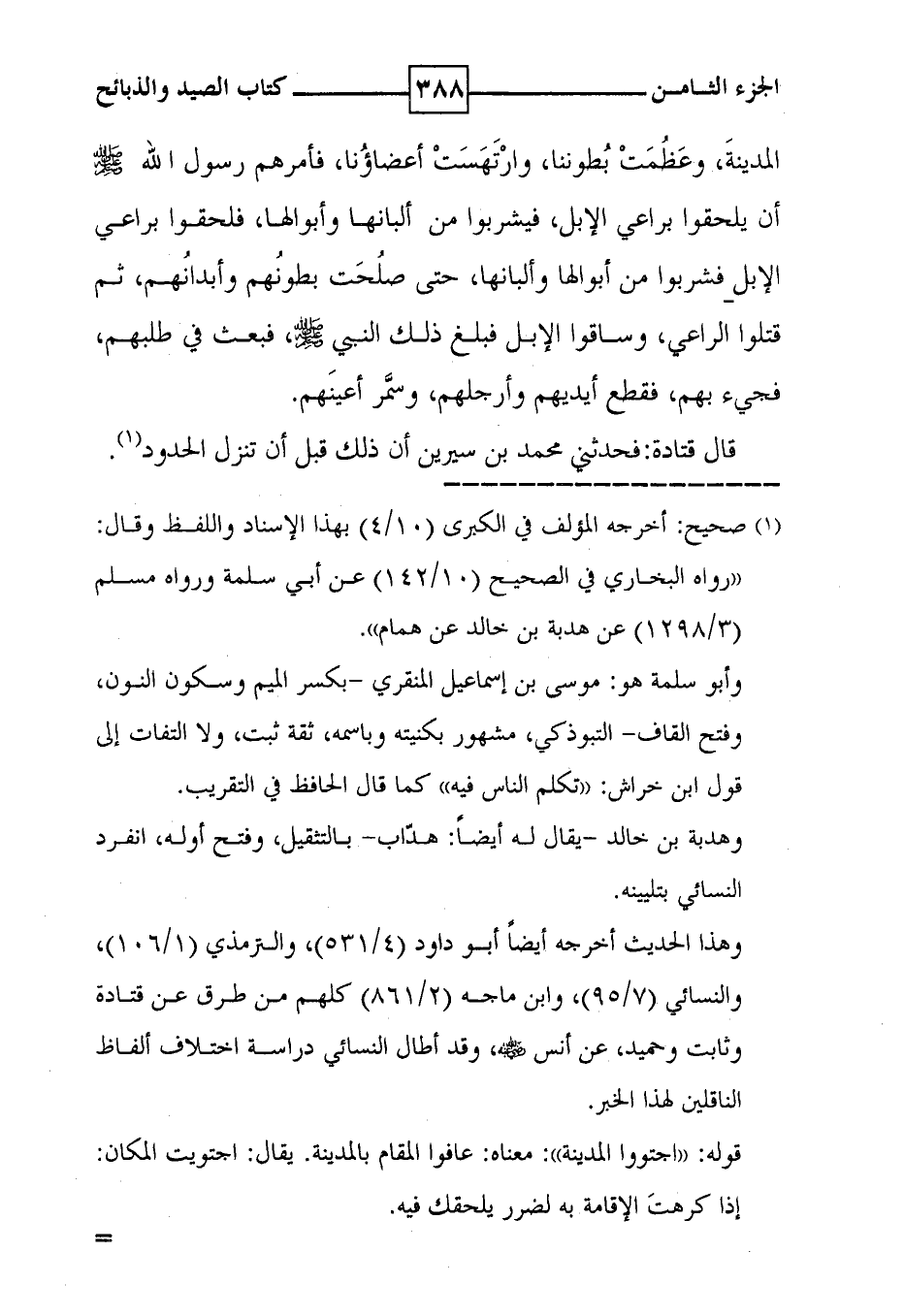 المدينة ، وعظمت بطوننا ، وارتهست أعضاؤنا ، فأمرهم رسول الله صلى الله عليه وسلم أن يلحقوا براعي الإبل ، فيشربوا من ألبانها وأبوالها ، فلحقوا براعي الإبل فشربوا من أبوالها وألبانها ، حتى صلحت بطونهم وأبدانهم ، ثم قتلوا الراعي ، وساقوا الإبل فبلغ ذلك النبي صلى الله عليه وسلم ، فبعث في طلبهم ، فجيء بهم ، فقطع أيديهم وأرجلهم ، وسمر أعينهم . قال قتادة : فحدثني محمد بن سيرين أن ذلك قبل أن تنزل الحدود ( 1 ) .