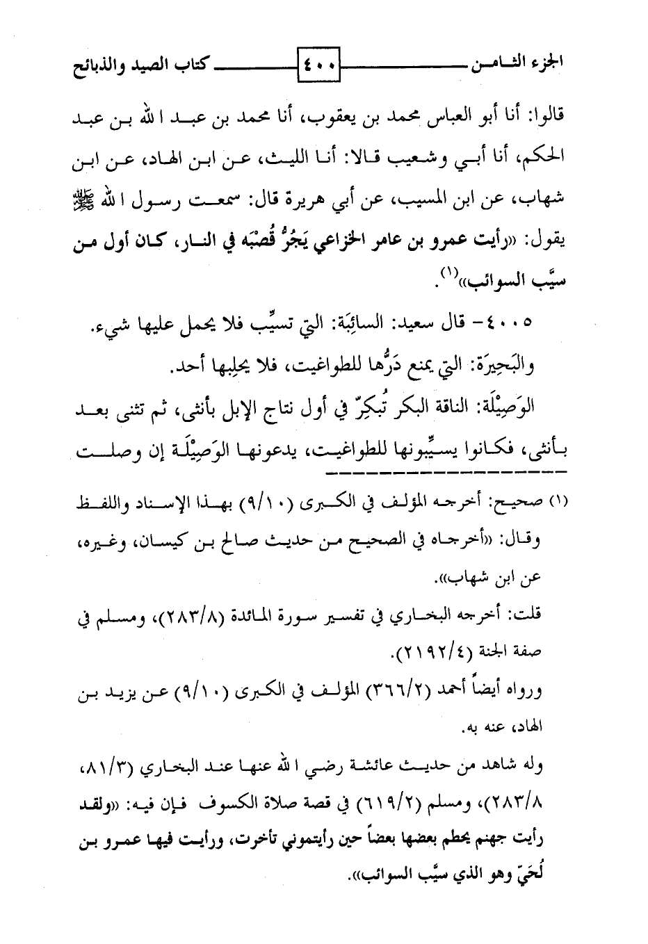 قالوا : أنا أبو العباس محمد بن يعقوب ، أنا محمد بن عبد الله بن عبد الحكم ، أنا أبي وشعيب قالا : أنا الليث ، عن ابن الهاد ، عن ابن شهاب ، عن ابن المسيب ، عن أبي هريرة قال : سمعت رسول الله صلى الله عليه وسلم يقول : ' رأيت عمرو بن عامر الخزاعي يجر قصبه في النار ، كان أول من سيب السوائب ' ( 1 ) .