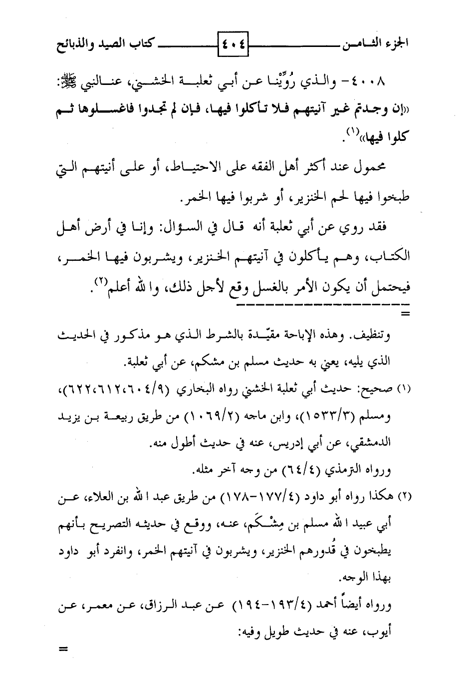 4008 - والذي روينا عن أبي ثعلبة الخشني ، عن النبي صلى الله عليه وسلم : ' إن وجدتم غير آنيتهم فلا تأكلوا فيها ، فإن لم تجدوا فاغسلوها ثم كلوا فيها ' ( 1 ) . محمول عند أكثر أهل الفقه على الاحتياط ، أو على أنيتهم التي طبخوا فيها لحم الخنزير ، أو شربوا فيها الخمر . فقد روي عن أبي ثعلبة أنه قال في السؤال : وإنا في أرض أهل الكتاب ، وهم يأكلون في آنيتهم الخنزير ، ويشربون فيها الخمر ، فيحتمل أن يكون الأمر بالغسل وقع لأجل ذلك ، والله أعلم ( 2 ) .