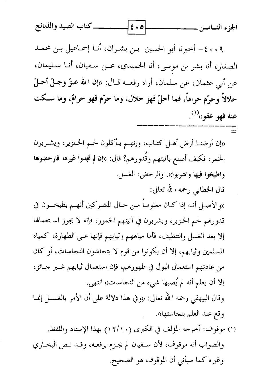 4009 - أخبرنا أبو الحسين بن بشران ، أنا إسماعيل بن محمد الصفار ، أنا بشر بن موسى ، أنا الحميدي ، عن سفيان ، أنا سليمان ، عن أبي عثمان ، عن سلمان ، أراه رفعه قال : ' إن الله عز وجل أحل حلالاً وحرم حراماً ، فما أحل فهو حلال ، وما حرم فهو حرام ، وما سكت عنه فهو عفو ' ( 1 ) .