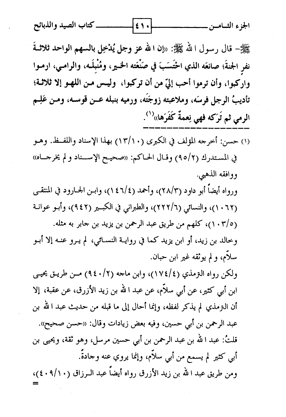 صلى الله عليه وسلم - قال رسول الله صلى الله عليه وسلم : ' إن الله عز وجل يدخل بالسهم الواحد ثلاثة نفر الجنة ؛ صانعة الذي احتسب في صنعته الخير ، ومنبله ، والرامي ، ارموا واركبوا ، وأن ترموا أحب إلي من أن تركبوا ، وليس من اللهو إلا ثلاثة ؛ تأديب الرجل فرسه ، وملاعبته زوجته ، ورميه بنبله عن قوسه ، ومن علم الرمي ثم تركه فهي نعمة كفرها ' ( 1 ) .