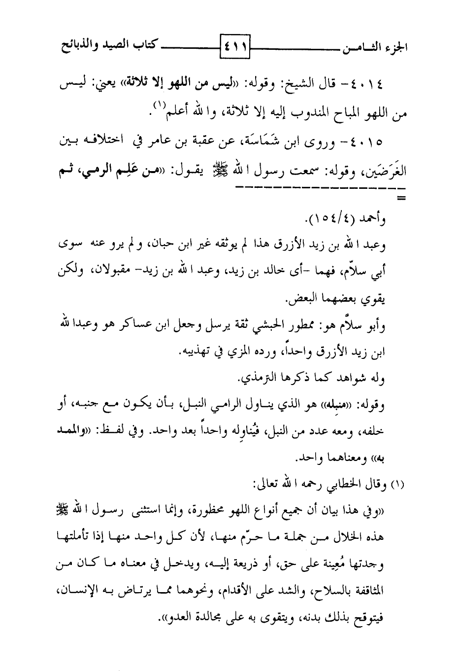 4014 - قال الشيخ : وقوله : ' ليس من اللهو إلا ثلاثة يعني : ليس من اللهو المباح المندوب إليه إلا ثلاثة ، والله أعلم ( 1 ) .