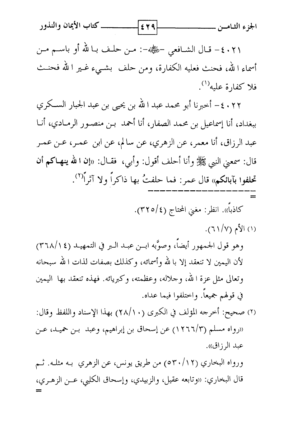4022 - أخبرنا أبو محمد عبد الله بن يحيى بن عبد الجبار السكري ببغداد ، أنا إسماعيل بن محمد الصفار ، أنا أحمد بن منصور الرمادي ، أنا عبد الرزاق ، أنا معمر ، عن الزهري ، عن سالم ، عن ابن عمر ، عن عمر قال : سمعني النبي صلى الله عليه وسلم وأنا أحلف أقول : وأبي ، فقال : ' إن الله ينهاكم أن تحلفوا بآبائكم ' قال عمر : فماحلفت بها ذاكراً ولا آثراً ( 2 ) .