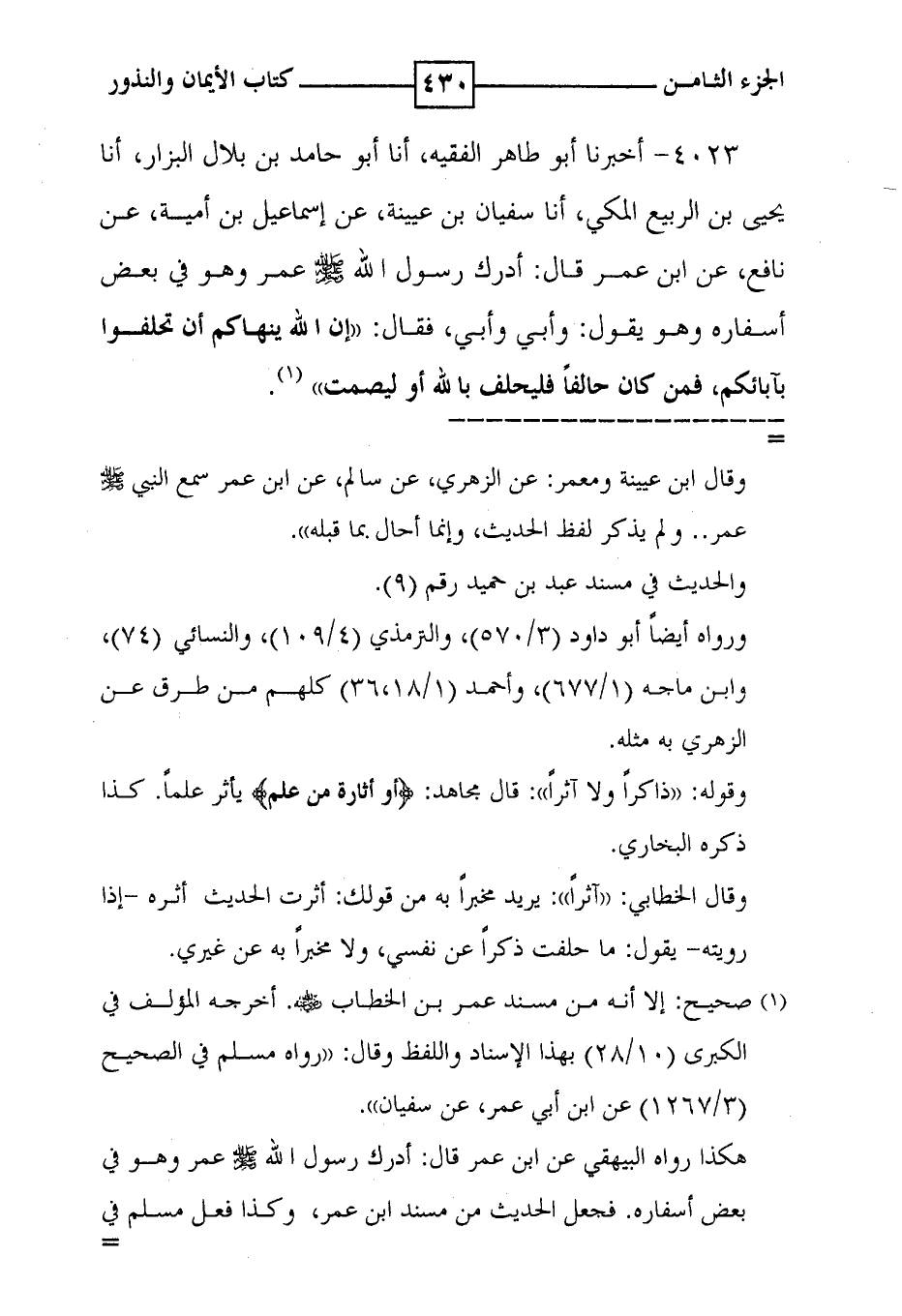 4023 - أخبرنا أبو طاهر الفقيه ، أنا أبو حامد بن بلال البزار ، أنا يحيى بن الربيع المكي ، أنا سفيان بن عيينة ، عن إسماعيل بن أمية ، عن نافع ، عن ابن عمر قال : أدرك رسول الله صلى الله عليه وسلم عمر وهو في بعض أسفاره وهو يقول : وأبي وأبي ، فقال : ' إن الله ينهاكم أن تحلفوا بآبائكم ، فمن كان حالفاً فيحلف بالله أو ليصمت ' ( 1 ) .