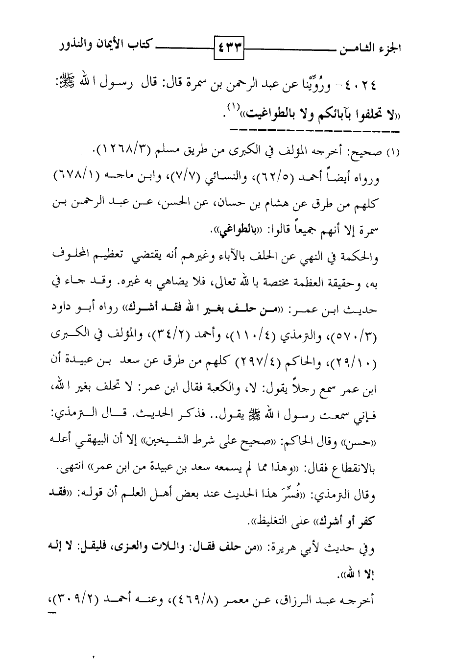 4024 - وروينا عن عبد الرحمن بن سمرة قال : قال رسول الله صلى الله عليه وسلم : ' لا تحلفوا بآبائكم ولا بالطواغيت ' ( 1 ) .