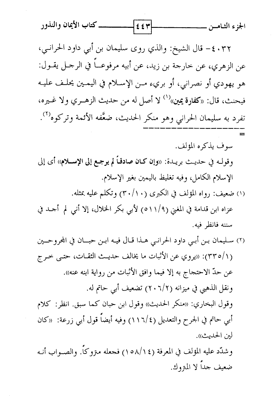 4032 - قال الشيخ : والذي روى سليمان بن أبي داود الحراني ، عن الزهري ، عن خارجة بن زيد ، عن أبيه مرفوعاً في الرجل يقول : هو يهودي أو نصراني ، أو بريء من الإسلام في اليمين يحلف عليه فيحنث ، قال : ' كفارة يمين ' ( 1 ) لا أصل له من حديث الزهري ولا غيره ، تفرد به سليمان الحراني وهو منكر الحديث ، ضعفه الأئمة وتركوه ( 2 ) .