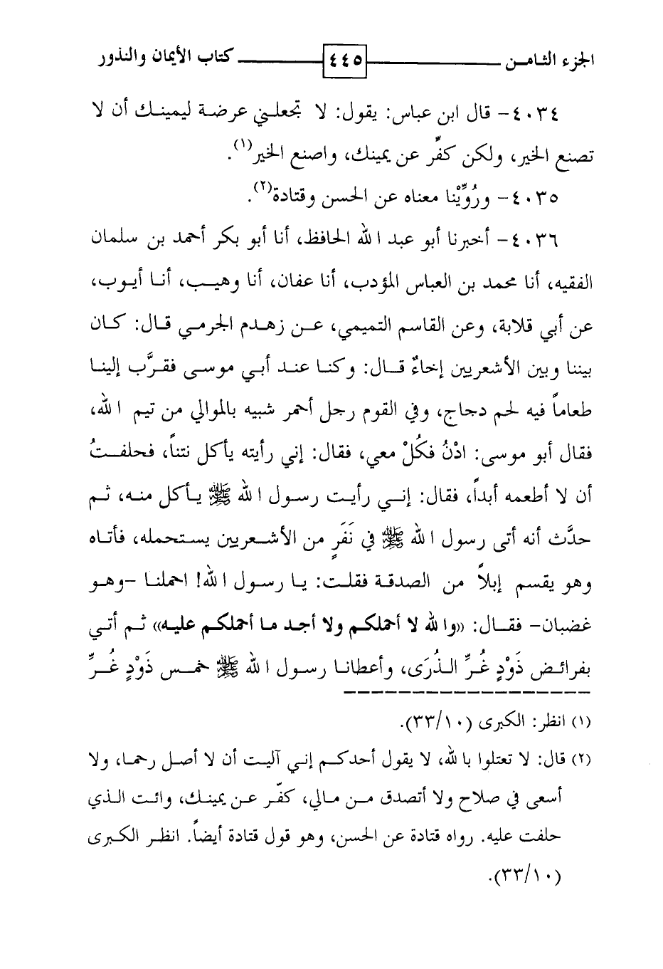 4036 - أخبرنا أبو عبد الله الحافظ ، أنا أبو بكر أحمد بن سلمان الفقيه ، أنا محمد بن العباس المؤدب ، أنا عفان ، أنا وهيب ، أنا أيوب ، عن أبي قلابة ، وعن القاسم التميمي ، عن زهدم الجرمي قال : كان بيننا وبين الأشعريين إخاء قال : وكنا عند أبي موسى فقرب إلينا طعاماً فيه لحم دجاج ، وفي القوم رجل أحمر شبيه بالموالي من تيم الله ، فقال أبو موسى : ادن فكل معي ، فقال : إني رأيته يأكل نتناً ، فحلفت أن لا أطعمه أبداً ، فقال إني رأيت رسول الله صلى الله عليه وسلم يأكل منه ، ثم حدث أنه أتى رسول الله صلى الله عليه وسلم في نفر من الأشعريين يستحمله ، فأتاه وهو يقسم إبلاً من الصدقة فقلت : يا رسول الله ! احملنا - وهو غضبان - فقال : ' والله لا أحملكم ولا أجد ما أحملكم عليه ' ثم أتى بفرائض ذود غر الذرى ، وأعطانا رسول الله صلى الله عليه وسلم خمس ذود غر