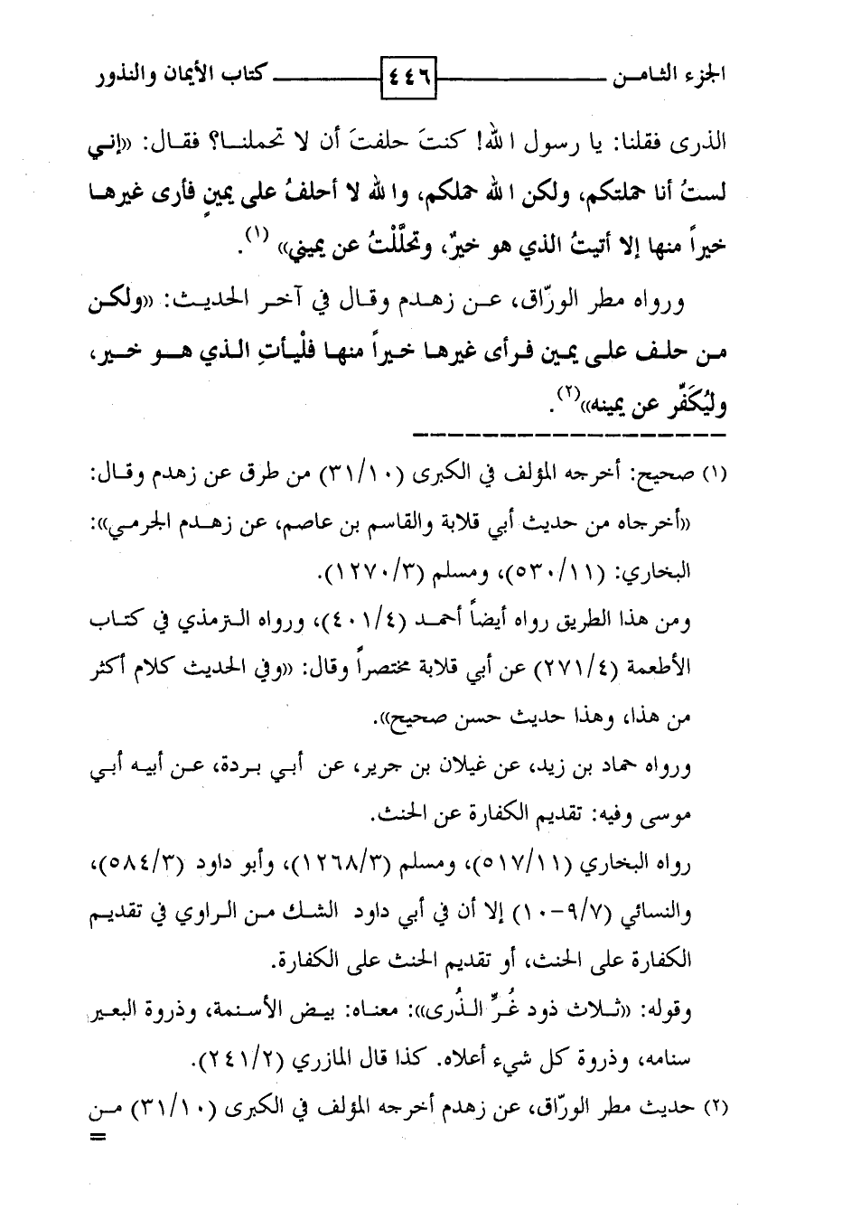 الذرى فقلنا : يا رسول الله كنت حلفت أن لا تحملنا ؟ فقال : ' إني لست أنا حملتكم ، ولكن الله حملكم ، والله لا أحلف على يمين فأرى غيرها خيراً منها إلا أتيت الذي هو خير ، وتحللت عن يميني ' ( 1 ) . ورواه مطر الوراق ، عن زهدم وقال في آخر الحديث : ' ولكن من حلف على يمين فرأى غيرها خيراً منها فليأت الذي هو خير ، وليكفر عن يمينه ' ( 2 ) .