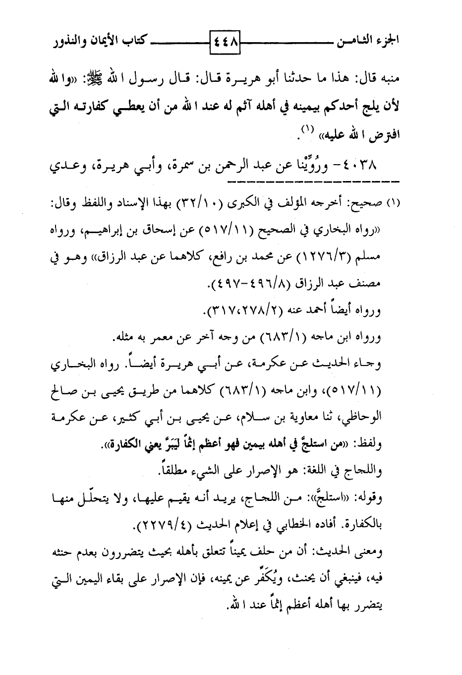 منبه قال : هذا ما حدثنا أبو هريرة قال : قال رسول الله صلى الله عليه وسلم : ' والله لأن يلج أحدكم بيمينه في أهله آثم له عند الله من أن يعطي كفارته التي افترض الله عليه ' ( 1 ) .