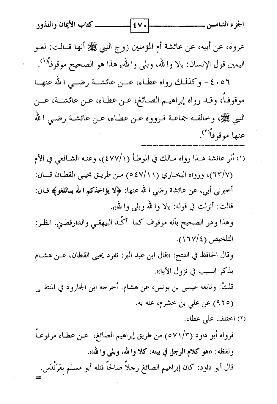 عروة ، عن أبيه ، عن عائشة أم المؤمنين زوج النبي صلى الله عليه وسلم أنها قالت : لغو اليمين قول الإنسان : ' لا والله ، وبلى والله ' هذا هو الصحيح موقوفاً ( 1 ) .