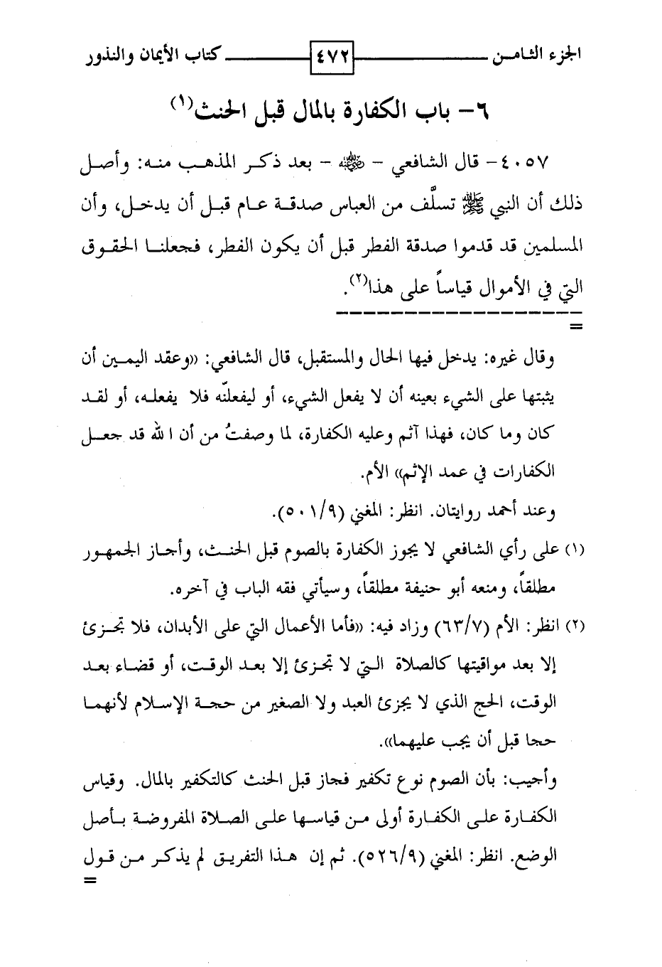 4057 - قال الشافعي - رضي الله عنه - بعد ذكر المذهب منه : وأصل ذلك أن النبي صلى الله عليه وسلم تسلف من العباس صدقة عام قبل أن يدخل ، وأن المسلمين قد قاموا صدقة الفطر قبل أن يكون الفطر ، فجعلنا الحقوق التي في الأموال قياساً على هذا ( 2 ) .