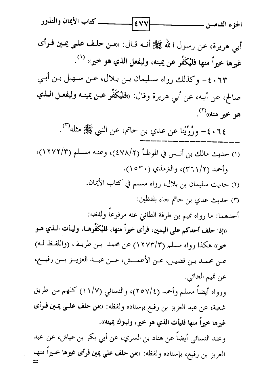 أبي هريرة ، عن رسول الله صلى الله عليه وسلم أنه قال : ' من حلف على يمين فرأى غيرها خيراً منها فليكفر عن يمينه ، وليفعل الذي هوخير ' ( 1 ) .